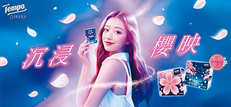 Tempo櫻花系列備有袋裝面紙、盒裝紙巾及閃鑽4層衛生紙,柔韌兼備,並通過皮膚科測試。現於各大網上商店購買Tempo產品滿$248,即可獲得限定櫻花光影杯套裝。