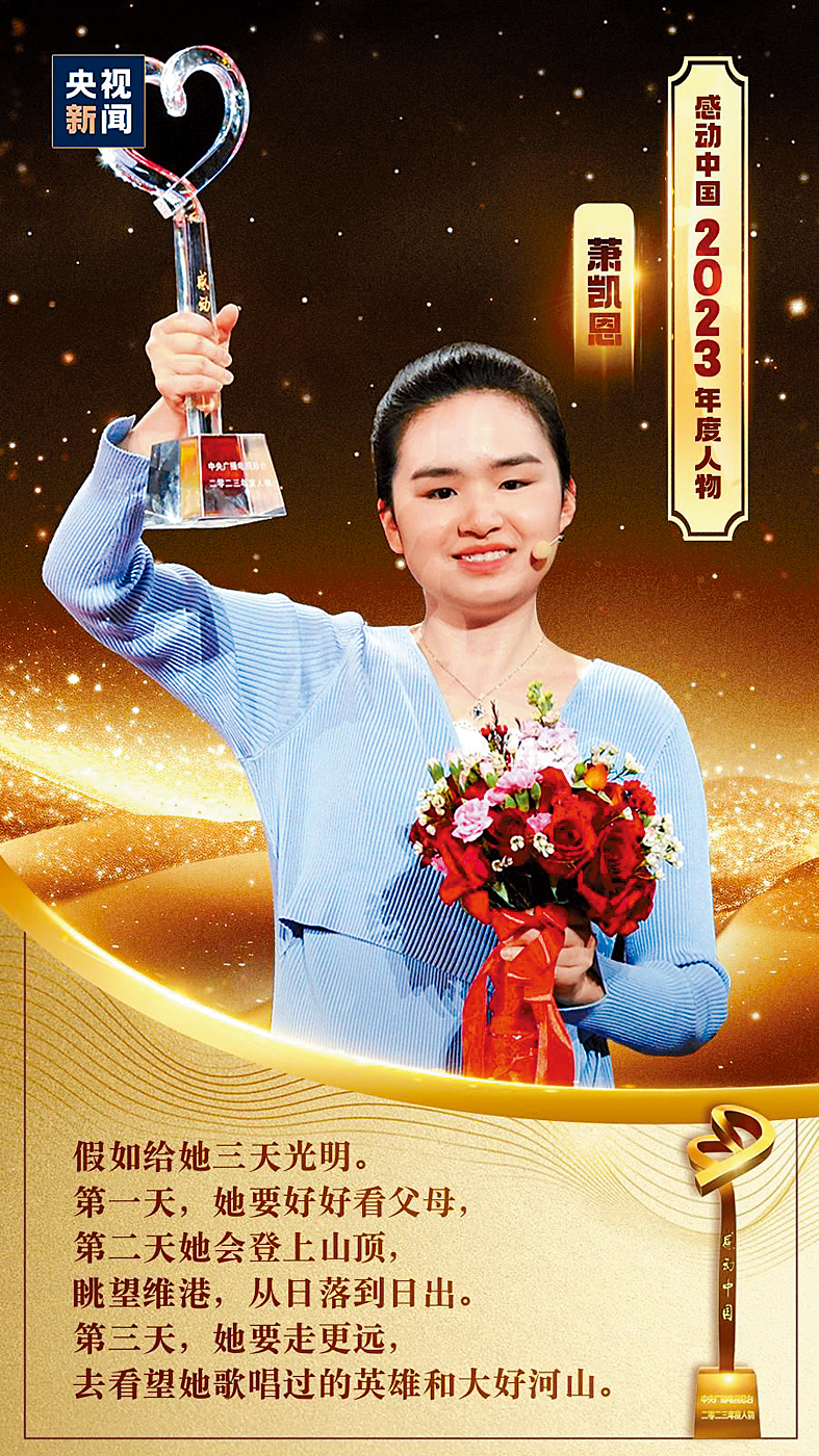 香港失明女高音歌唱家蕭凱恩(見圖)上榜內地《感動中國2023年度人物》,佢出生3個月時就因為眼疾失明,但父母對佢不離不棄,支持佢學習音樂,而堅強嘅佢自幼就學識彈琴同唱歌,仲經常參加義演籌集善款。小妹深受感動,凱恩獲此殊榮可謂實至名歸。