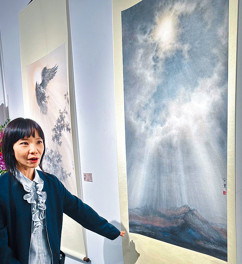 聽畫家在水墨化染之意。羅令潔(Rebecca Lo,見圖)說,廣闊的天空,陽光穿透射下,照耀高山峻嶺之地,但在高山左右兩邊山麓,點點燈火,聚居了兩群人,作品名為《暝色》,意境於夕陽之際。