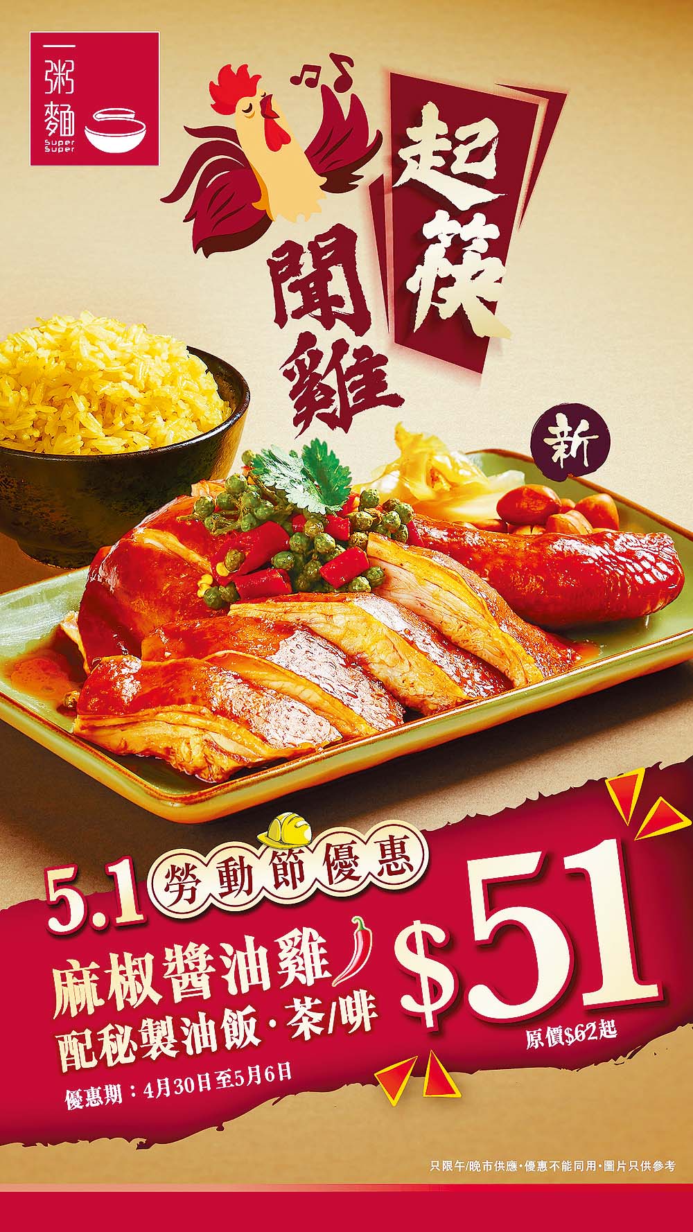 由4月30日至5月6日,一粥麵更推出5.1勞動節限時7天優惠,只需以開心價$51即可享麻椒醬油雞配秘製油飯套餐;由即日起至5月6日加$3更可將餐飲升級至椰汁紅豆冰,在初夏解暑一流。
