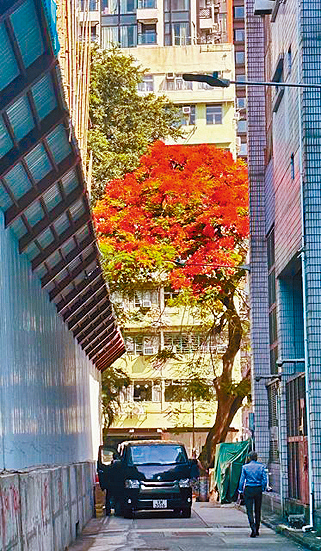 周末路過銅鑼灣中央圖書館,向大坑方向走,就在左右唐樓的窄巷盡頭,窺見紅唇烈燄的紅,原來是鳳凰木開花,繞了一圈,回到維多利亞公園,鳳凰木肆無忌憚地開花,一株接一株,令人想起火燒連環船,望着望着,心情像被星光燃點,不期然發覺,四周陽光普照,差不多半個月的下雨氣候過去了,除之而來是初夏的溫度。