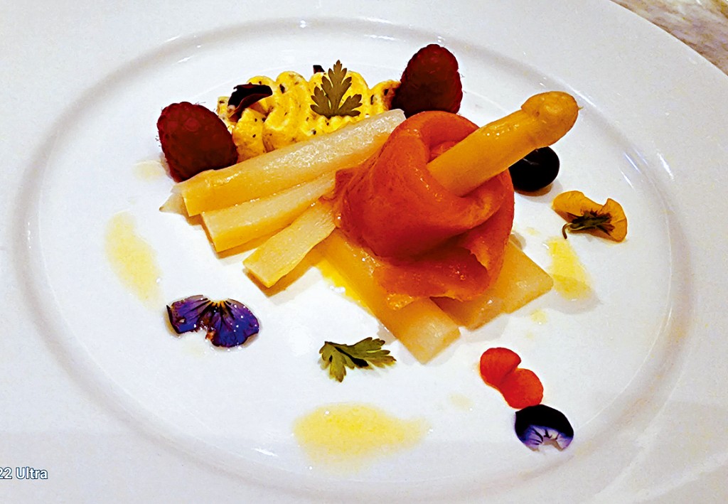 揭開序幕是水煮白蘆筍及煙三文魚(見圖),白蘆筍是西菜中的珍貴美食,素有「白色黃金」之稱。當晚所吃的白蘆筍味清甜而口感鮮嫩爽脆,實屬佳品,與三文魚的煙燻風味堪稱絕配。接著是加入香煎帶子的白蘆筍忌廉湯,以及紅蝦自家製墨魚汁意大利麵;主菜可選香煎白鱈魚或燒美國頂級肉眼,均伴以鮮甜的白蘆筍;壓軸是該店著名夏日甜品意大利乾果麵包味雪糕蛋糕,為當晚美食之旅畫上完美句號。