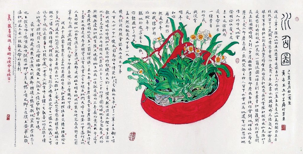 黃永玉先生百歲畫展中有他95歲時畫的一幅水仙,一叢水仙花種在一個鮮紅的花盆中怒放,形態生動,色彩強烈。在水仙花周圍,是永王先生寫的長跋。這也是他的特色,他的畫常常帶着長長的文字,畫好看,文字生動活潑,相得益彰,一幅藝術作品的層次由此拔高。