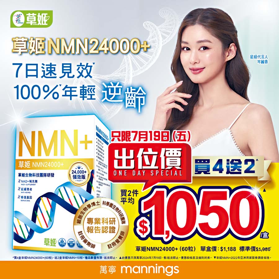 喺7月19日(五)萬寧出位價,草姬NMN24000+買2盒即享平均$1,050、單盒價$1,188/盒(原價$1,980),買4盒仲加碼送草姬NMN+ 10粒裝2盒,優惠只限1天。而優惠只限萬寧,售/送完即止。