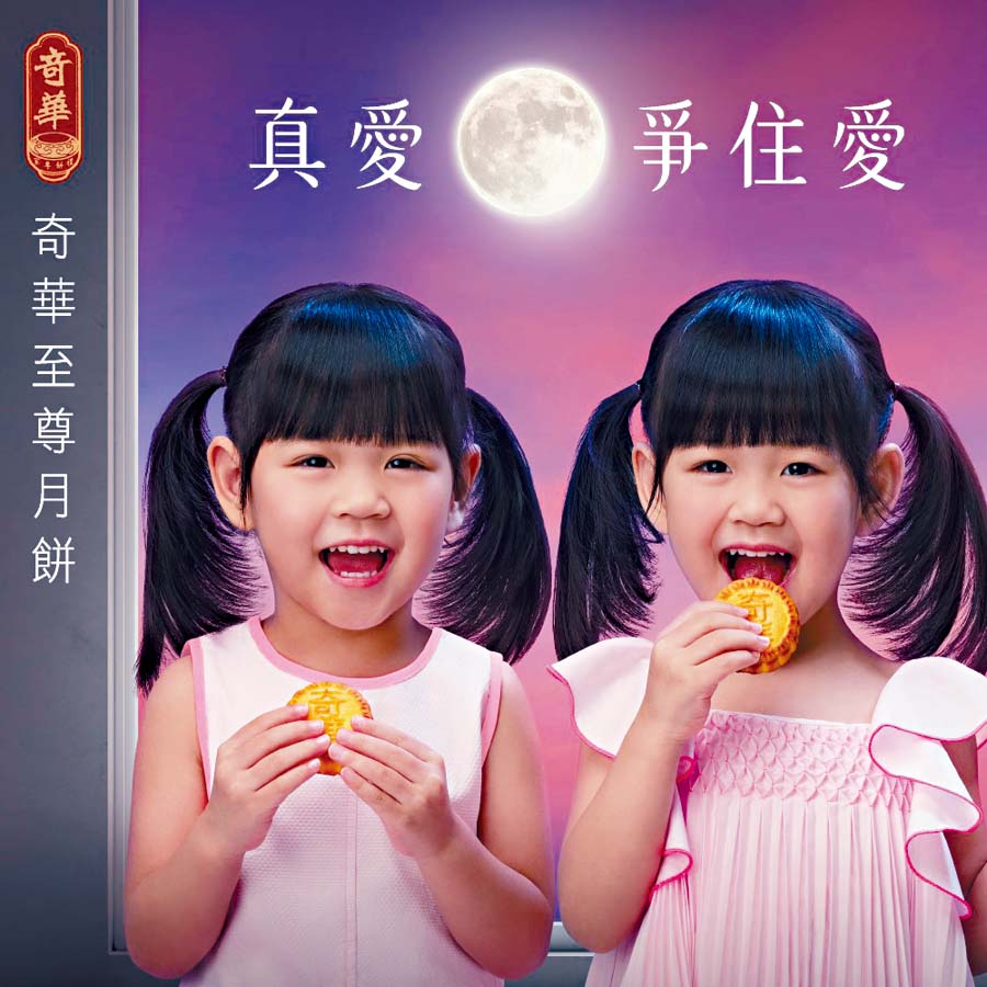 奇華餅家今年的全新電視廣告全片用了六對不同年齡的雙胞胎姊妹拍攝,內容是以一對雙胞胎的成長作出發點,展示雖然過程離不開爭爭吵吵,但這一切都是源自關懐及珍惜彼此的「真愛」;藉此帶出人與人之間,既有愛又愛爭的微妙關係。這些大家都可能經歷過的情景,能與家人在中秋團圓的日子一起回味,定必令人會心微笑!