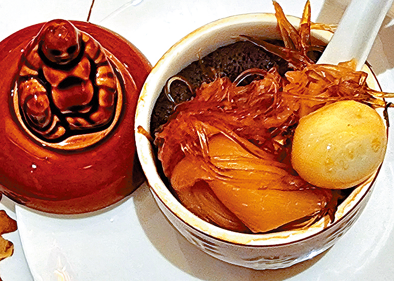 吃過佛跳牆的人不少,但不一定知道佛跳牆此名菜的由來,以及正宗的製作方法。聽精研閩菜逾50載的羅師傅講,佛跳牆這菜式誕生已有148年歷史,由福州始於清代的老字號食府聚春園所創,因其味道出眾,食材珍貴,故能由清朝年間流傳至今,不但成為閩菜代表菜,更成為國宴菜式。至於菜名的由來,傳聞在一次文人聚會的筵席上,大家得嘗此菜後紛紛叫好,有人即席賦詩曰:「罎啟葷香飄四鄰,佛聞棄禪跳牆來」,自此,此道菜就稱為佛跳牆了。
