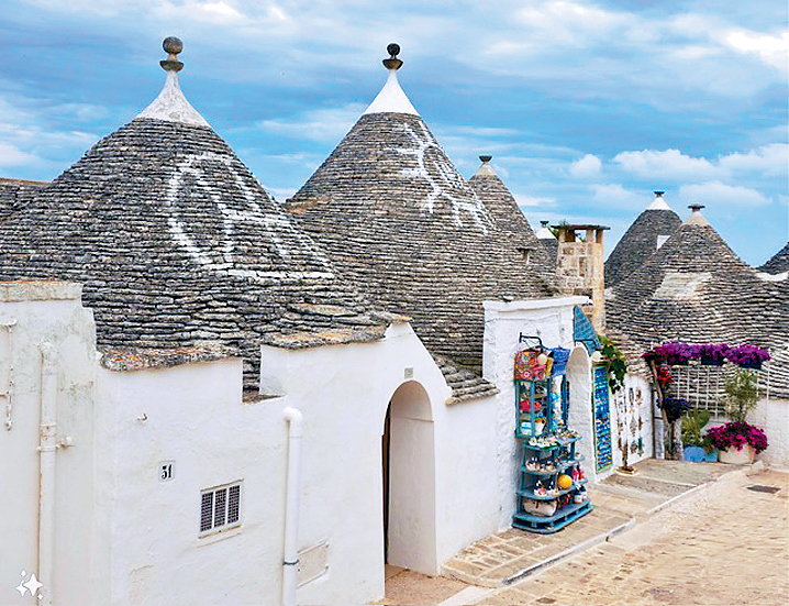 這種奇特的蘑菇形建築叫trullo,以石灰岩建成並塗成白色,屋頂用扁平的石塊堆成圓錐形。據說在古時每到收稅的時候,居民們就拆掉屋頂,表示不能住人,這樣便可以免交稅了。難得的是Alberobello這小鎮保存了近1千4百棟蘑菇屋,幾百年來一直被使用着。現時只有4百餘棟有人居住,其他的已改裝成咖啡廳、商店或民宿。
