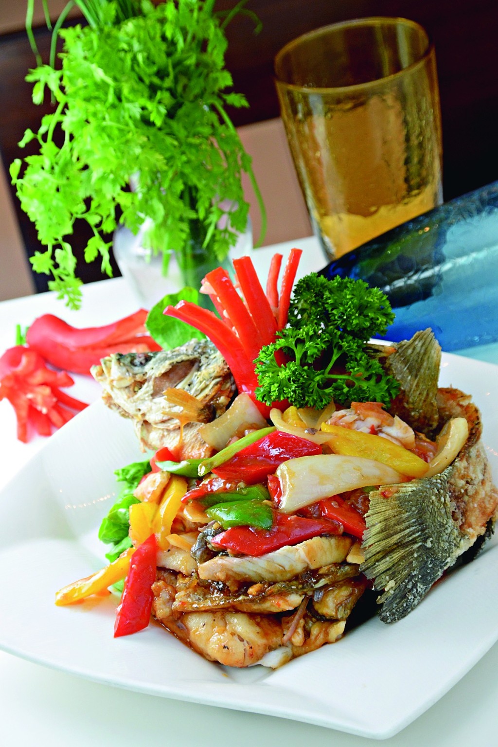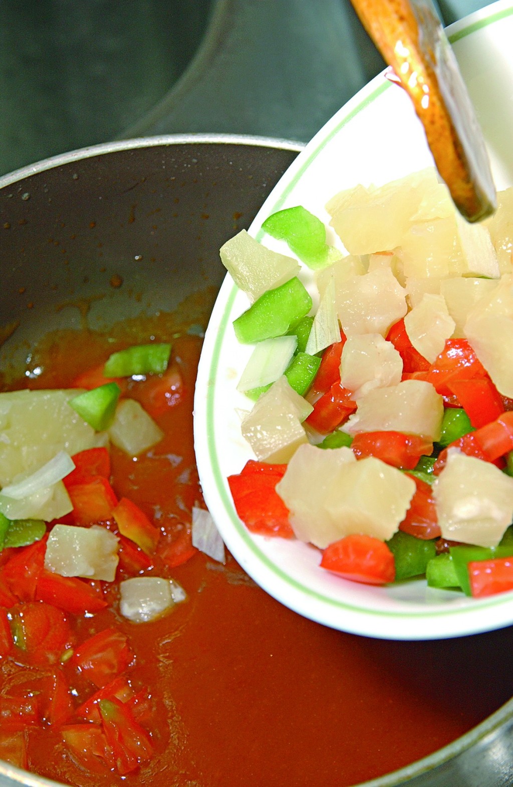 5. 炒香蒜蓉,下菠蘿片及雜菜豆炒勻。加入步驟(4)材料,煮至微稠,淋汁在魚柳上即可。