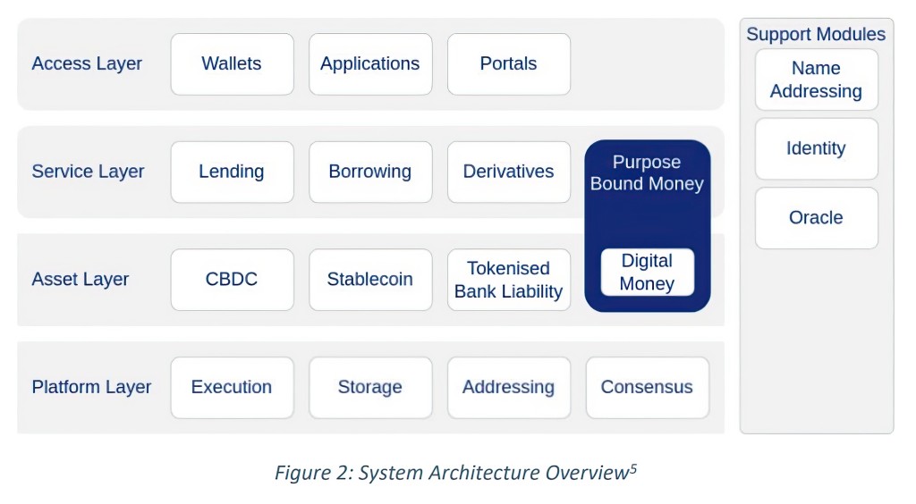 白皮書重點闡述了目的綁定代幣 (PBM) 框架,詳細描述了PBM從發行到贖回的生命週期技術規範,以及支持其運作的協議。 PBM利用區塊鏈和智能合約技術,將貨幣的用途限制於特定的目的或用途,實現預先設定的規則和條件。白皮書還引入了一個四層模型來描述PBM協議,將數位貨幣網路的組件分為接入層、服務層、資產層和平台層。