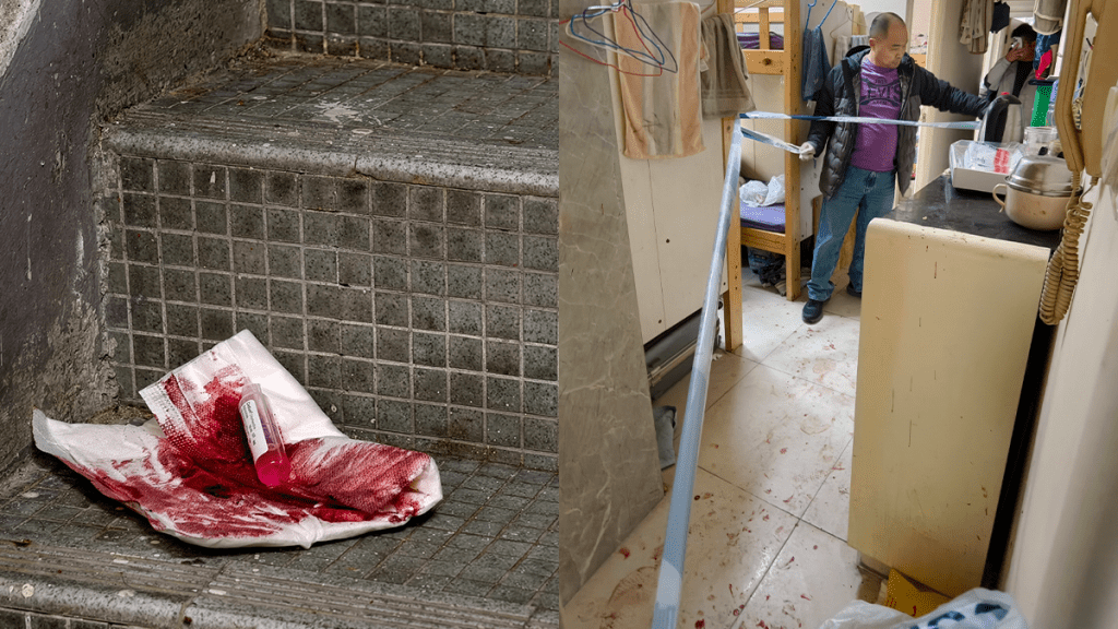 旺角發生傷人血案。今日(11日)下午2時許,警方接獲報案,指兩名男子於通菜街111至117號東寶大廈一單位內發生爭執,繼而動武。救援人員接報到場,發現一名51歲姓辛的內地男子中刀流血,頭部有一處5厘米的傷口,幸仍然清醒,隨即由救護車送往醫院接受治理,而施襲者則逃去無蹤。 現場所見,涉事單位放有3至4張碌架床,屋內遺下大量鮮血,而屋外的梯間亦有血迹。事後警方在梯間發現一把涉案菜刀,經初步調查,相信案
