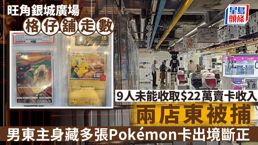 旺角銀城廣場一間「彈珠格仔舖」,租借透明格仔予人出售遊戲卡,詎料該店早前被揭發突然結業。警方於上月26日接獲當中9名受害人報案,報稱未能收取共逾22萬元的出售遊戲卡收入,懷疑格仔舖店東捲款潛逃。人員經調查後,於昨日(10日)在落馬洲管制站拘捕涉案的一名35歲姓王男東主,並在他身上搜出多張Pokémon(寶可夢)遊戲卡。警方正追緝其餘涉案的一男一女格仔舖東主。 消息稱,被捕人於昨日下午5時許經落馬洲