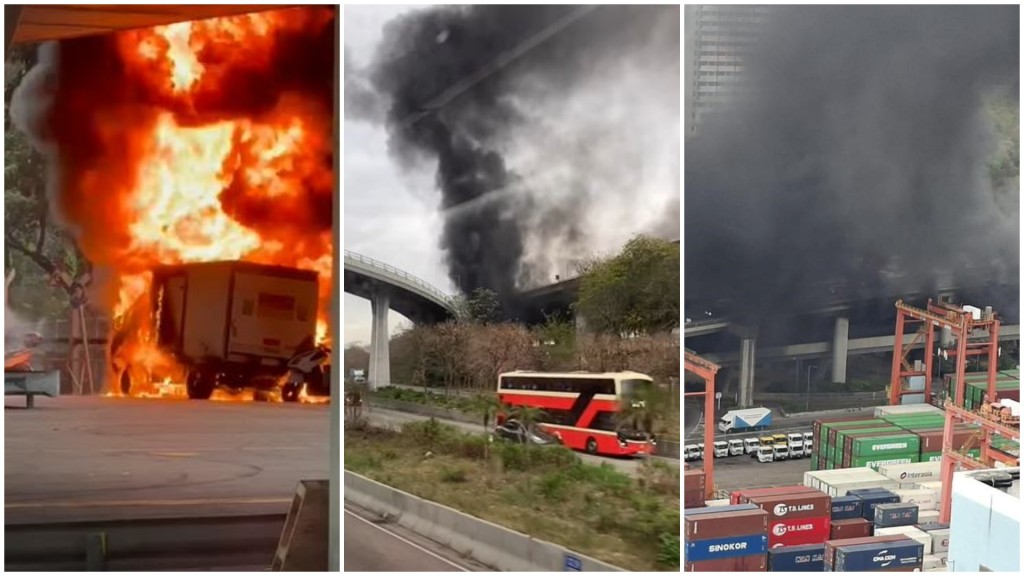有片│葵涌貨櫃碼頭露天停車場載易燃液體貨車著火 傳出爆炸聲 濃煙席捲半空