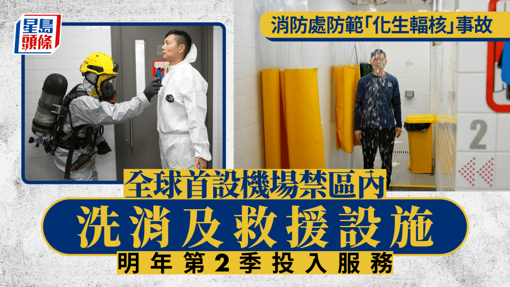 機場第三跑道已於去年投入服務,而第三跑道系統的其他工程亦陸續投入服務。為應付跑道的消防及救護服務需求,消防處機場消防隊增設多種設施,當中全球首個位於機場禁區內的洗消及救援設施已完工,將於明年第2季正式投入服務,用作迅速應對在機埸禁區範圍內或航機上發生的化學、生物、輻射或核事故, 為受污染的市民提供洗消服務,進一步保障公眾安全。