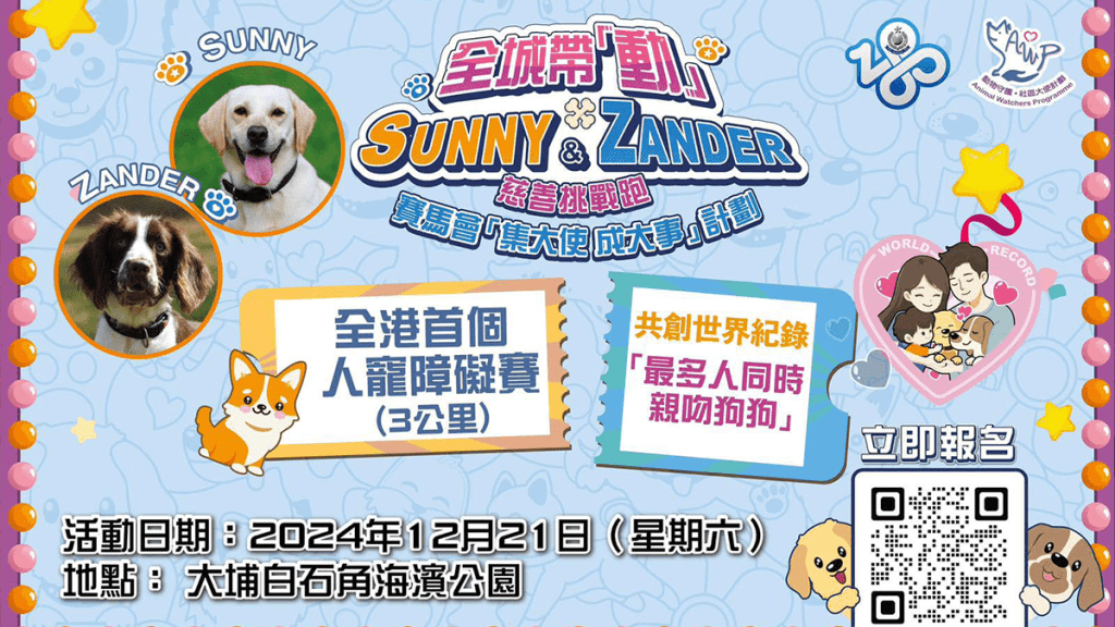 「動物守護 • 社區大使」計劃 (AWP)將於12月21日在大埔白石角海濱公園舉行「全城帶『動』 x Sunny & Zander 慈善挑戰跑」。活動除有刺激的障礙跑,參賽者更可與自己的愛犬齊齊參與世界紀錄挑戰— 「最多人同時與狗狗親吻」。