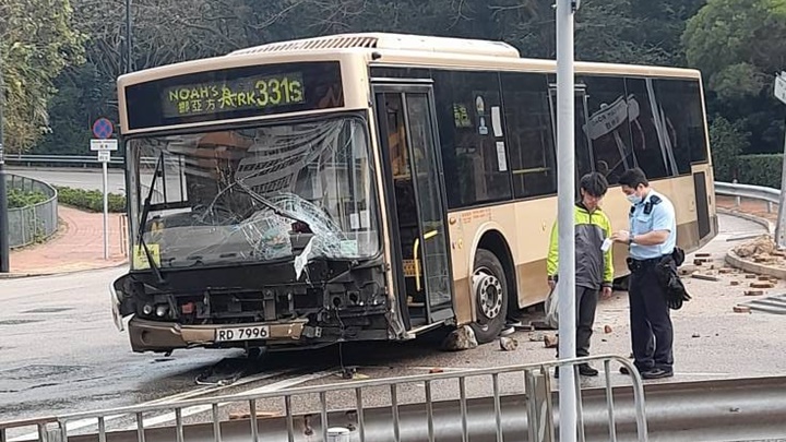 今(27日)午3時許,一輛九巴331s路線前往馬灣挪亞方舟主題公園,駛至珀林路迴旋處時,失控撼路牌及欄杆,九巴車頭玻璃爆裂,車上乘客需要轉車,其中一名女乘客報稱不適送院。