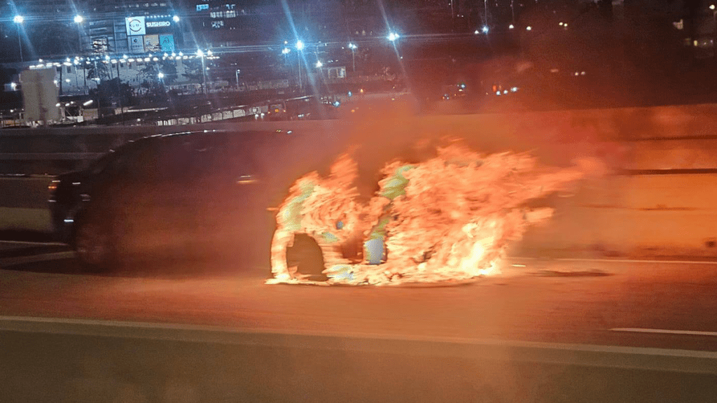 根據網上圖片所見,私家車車頭陷入火海,火勢相當猛烈,大量黑煙升上半空,遠處清晰可見。