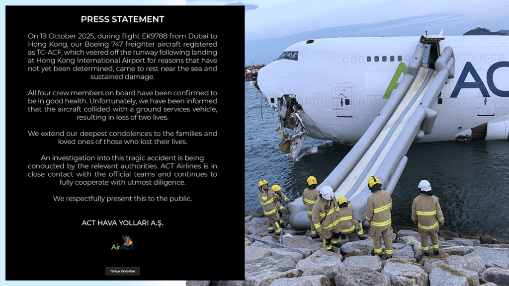 香港國際機場今日(10月20日)發生一部波音747-400貨機墮海,致地勤兩死事故。涉事航空公司Air ACT(ACT Airlines)於本港時間今日下午5時許在官網發聲明,對兩名離世地勤表達最深切哀悼,並提到客機偏離跑道原因目前待定,Air ACT會與當局保持密切聯繫,並將全力配合調查。另外阿聯酋航空亦表示,該貨機是其公司「濕租」(wet-lease)自ACT Airlines,所有機組人員安全,機上亦無運載貨物。