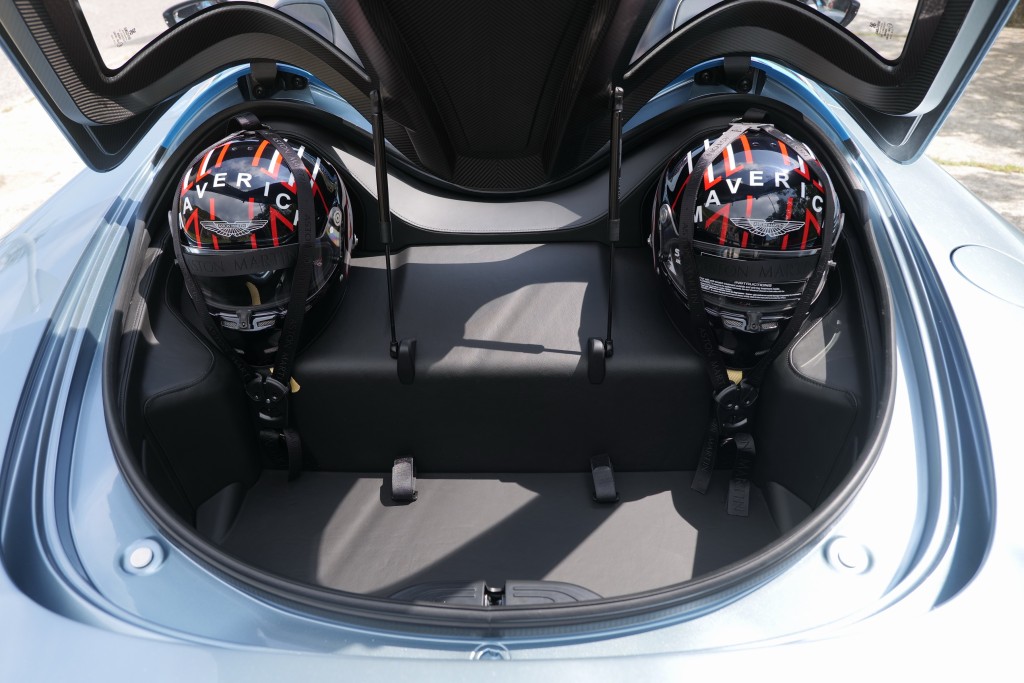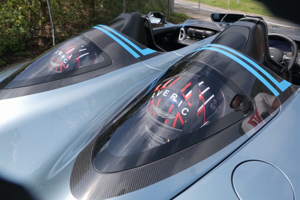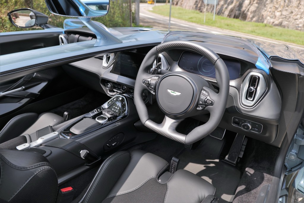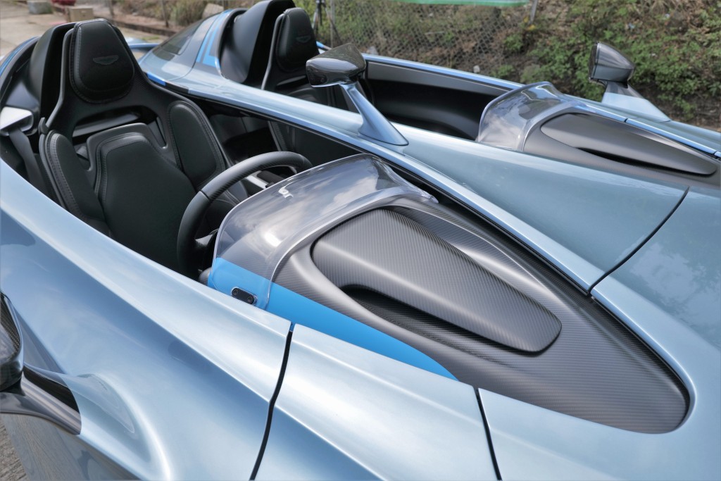 據Aston Martin香港代理董事總經理Gordon Choy透露,V12 Speedster本地配額不超過五輛,全部名花有主。圖中所見這輛,是按車主個人要求,以《Top Gun:Maverick》電影F/A-18 Hornet大黃蜂戰機顏色及拉花為主題,獨一無二。車子香港連稅定價1,730萬元起,尚未計算附加項目及個人化訂製配飾。很多人認為逾千萬元身價非常昂貴,不過相似無頂格式的法拉利SP1/SP2(全球限量499輛)或McLaren Elva(全球限量129輛),兩者未連稅車價已超過1,500萬港元起,即是相比V12 Speedster(未連稅約800萬元)貴近一倍!