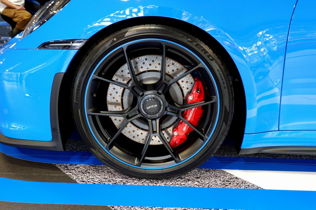 現場所見,新一代911 GT3即使不是RS版,外表霸氣已經十足,全套專用設計輕量化車身擾流,包括用上碳纖維強化複合材料(CFRP)製成的車頭及車尾引擎艙蓋、輕量化玻璃車窗、輪圈,還有輕量化跑車排氣系統,車身重量只有1,418kg。新車堅持採用4公升水平對向六汽缸自然吸氣引擎,馬力510ps、扭力47.9kgm,極限轉數高達9,000rpm。展覽車配用6速棍波,據知買家也可選配7速PDK半自動波箱。車子另一特點是引用了911 RSR賽車的前雙搖臂懸掛格式,還有跑車化設定的後輪轉向系統,據講攻彎操控有大幅進步。