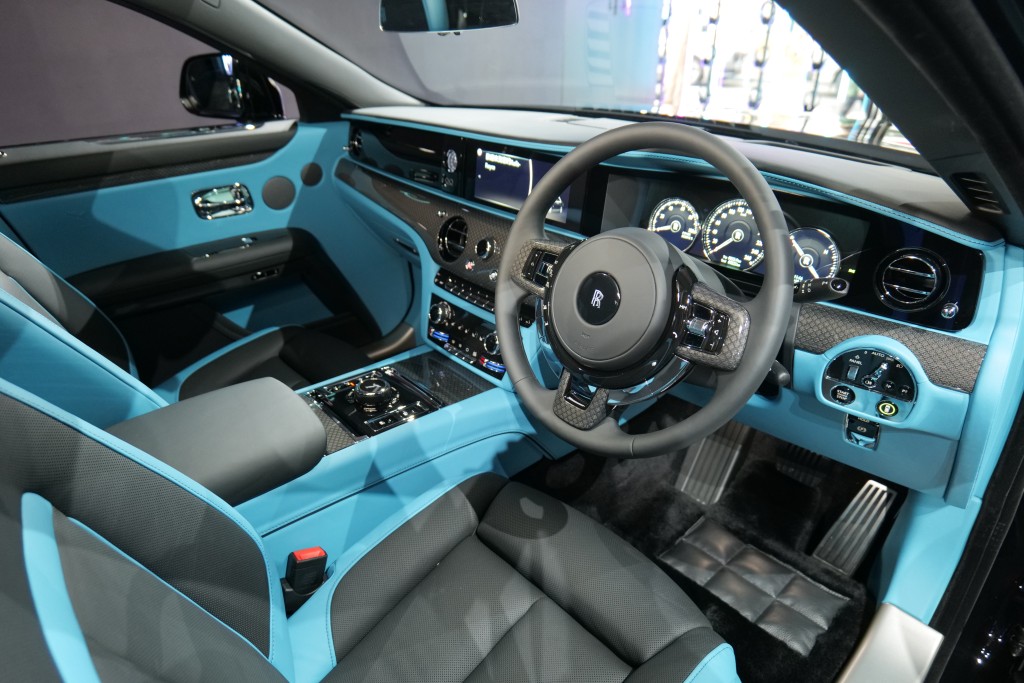 示範車室內以Turchese淺藍與黑色皮革包裝,後排配有2+1座位組合,還有左右餐桌及資訊大屏幕,單是後排設施須另加30多萬元,不過全車最昂貴配置是Starlight星空天花頂,以152顆LED發出光源,營造流星夜空景象,連稅盛惠50多萬元。Black Badge版車廂四周標準配有Technical Fibre飾板,以碳纖維和金屬纖維編織鑲嵌。