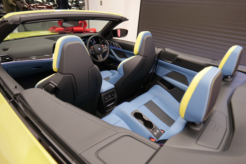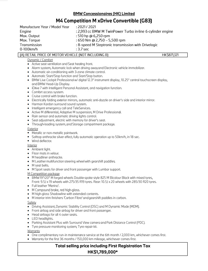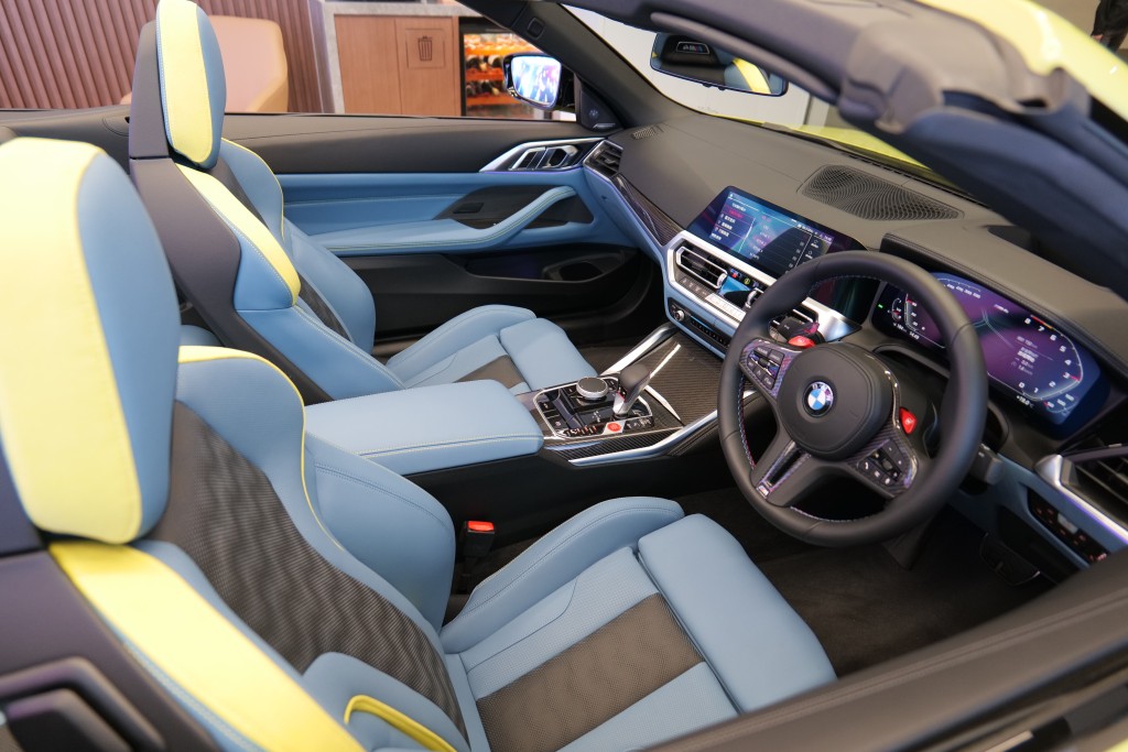 四驅版M4 Competition沿用3公升直六M Power雙Turbo引擎,馬力510ps、扭力66.3kgm,配合8速M Steptronic自動波箱,以及M xDrive專用電子四驅系統,0至100km/h加速僅3.7秒。標準配套包括全車Merino真皮座椅、12.3吋數碼表板、10.25吋觸控屏幕連iDrive 7語音導航多媒體系統、還有主控式M電子懸掛及M Differential Lock差速鎖。電動軟篷可於車速50km/h車速或以下自由開關,開合時間約18秒。據知M3及M4現時交付期約需六個月,不過現場展示這輛M4四驅開篷版暫時名花未有主。