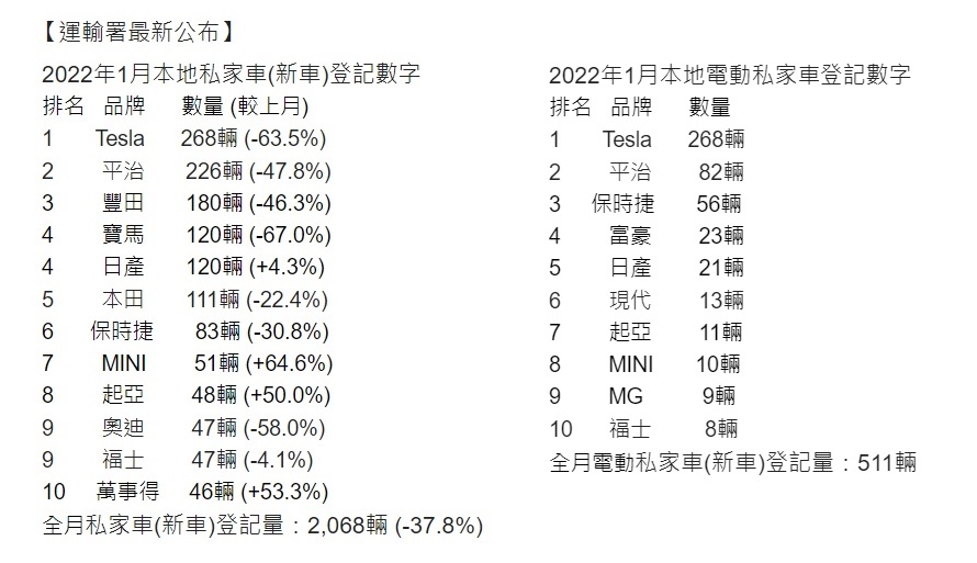 本地車市|運輸署最新公布 1月新車登記量大跌三成七 Tesla企穩榜首