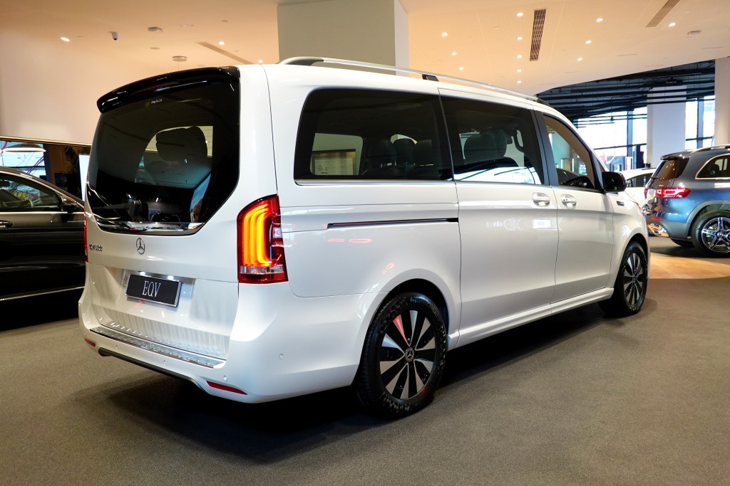 EQV跟原有V-Class一樣在西班牙北部Vitoria廠房生產。Long及Extra Long版車身長度分別為5,140mm及5,370mm,軸距分別為3,200mm及3,430mm。EQV300 Long頂級版焦點是後排配有兩張獨立大班椅,附設二段位置記憶、冷暖透氣及伸縮腳墊功能。其他豪華設施包括車廂氣氛燈、10吋觸控屏幕內置MBUX多媒體系統連EQ專屬操作介面,還有360度環迴鏡頭、小型雪櫃及Burmester環迴音響等豪華配套。