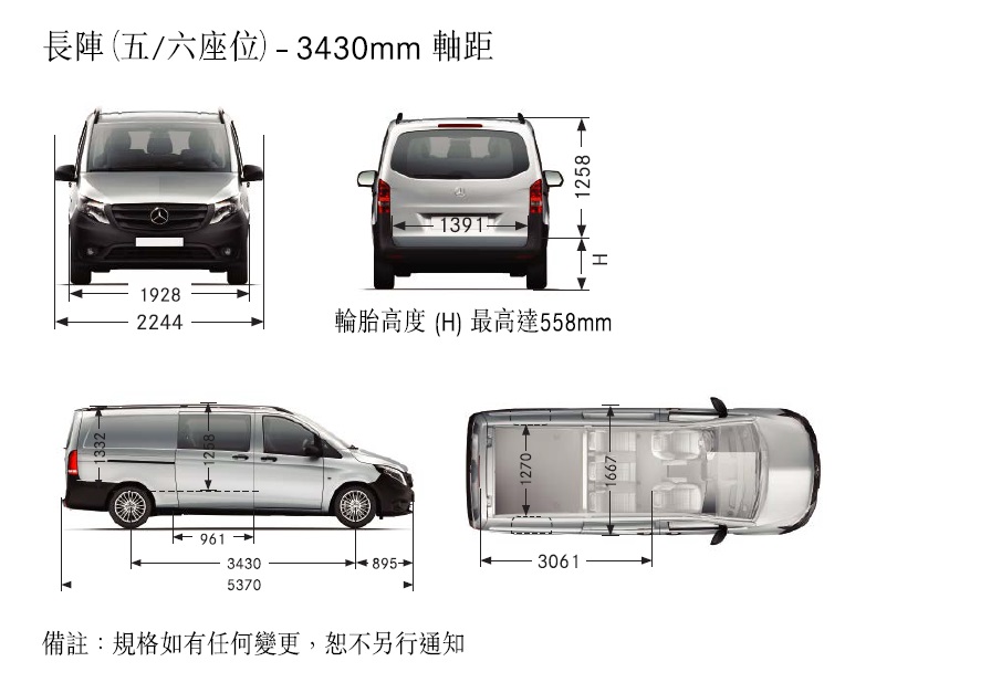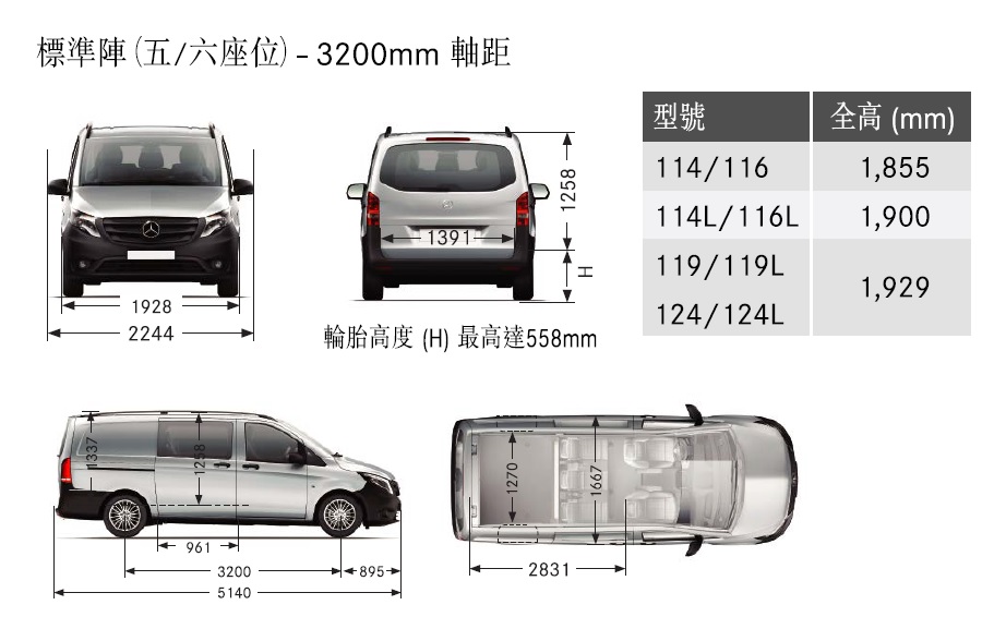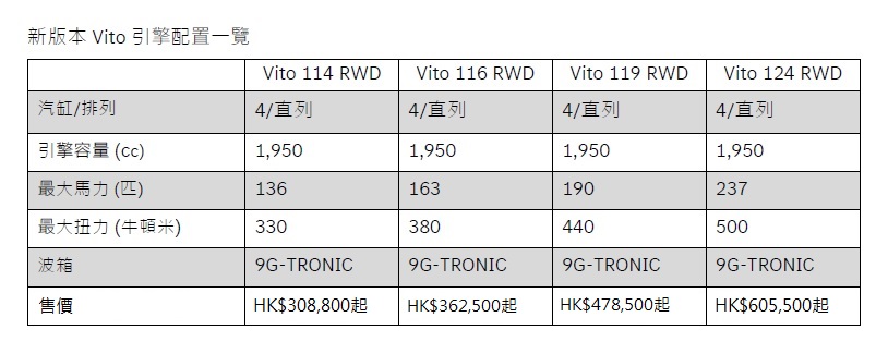 平治剛宣布升級新版Vito柴油客貨車已經抵港,即日(6月20日)起於九龍灣平治商用車專店(宏照道33號國際交易中心地下)公開展出,一式四款引擎輸出包括Vito 114、Vito 116、Vito119及最新Vito 124提供三座、五座及六座共12個不同組合供選購,車價由HK$308,800起至HK$605,500起,詳見下圖: