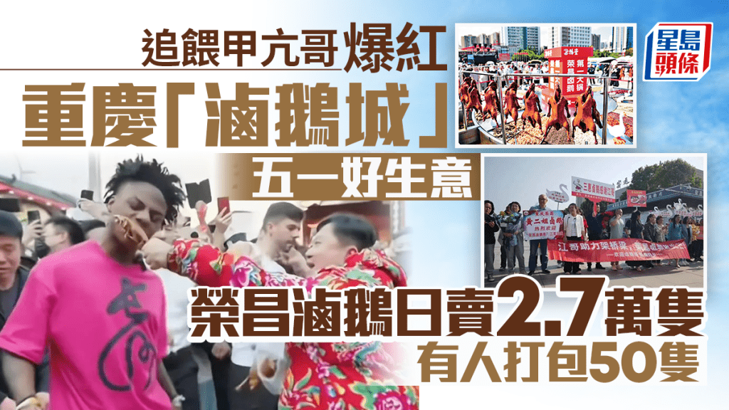 重慶榮昌區成為五一黃金周新晉頂流旅遊目的地,假期首日遊客數破35萬。超過7000名遊客擠爆榮昌政府食堂,吃掉千餘斤米飯和豬肉,飯碗都不夠用。今次榮昌爆火源於當地網紅「滷鵝哥」林江,此前他在美國頂流網紅「甲亢哥」中國行直播時連追5城,在香港、深圳等地反覆向其熱情「投餵」榮昌滷鵝,相關視頻瘋傳全網。目前從重慶到榮昌的高鐵票幾乎售罄,榮昌滷鵝一天賣了逾2.7萬隻。