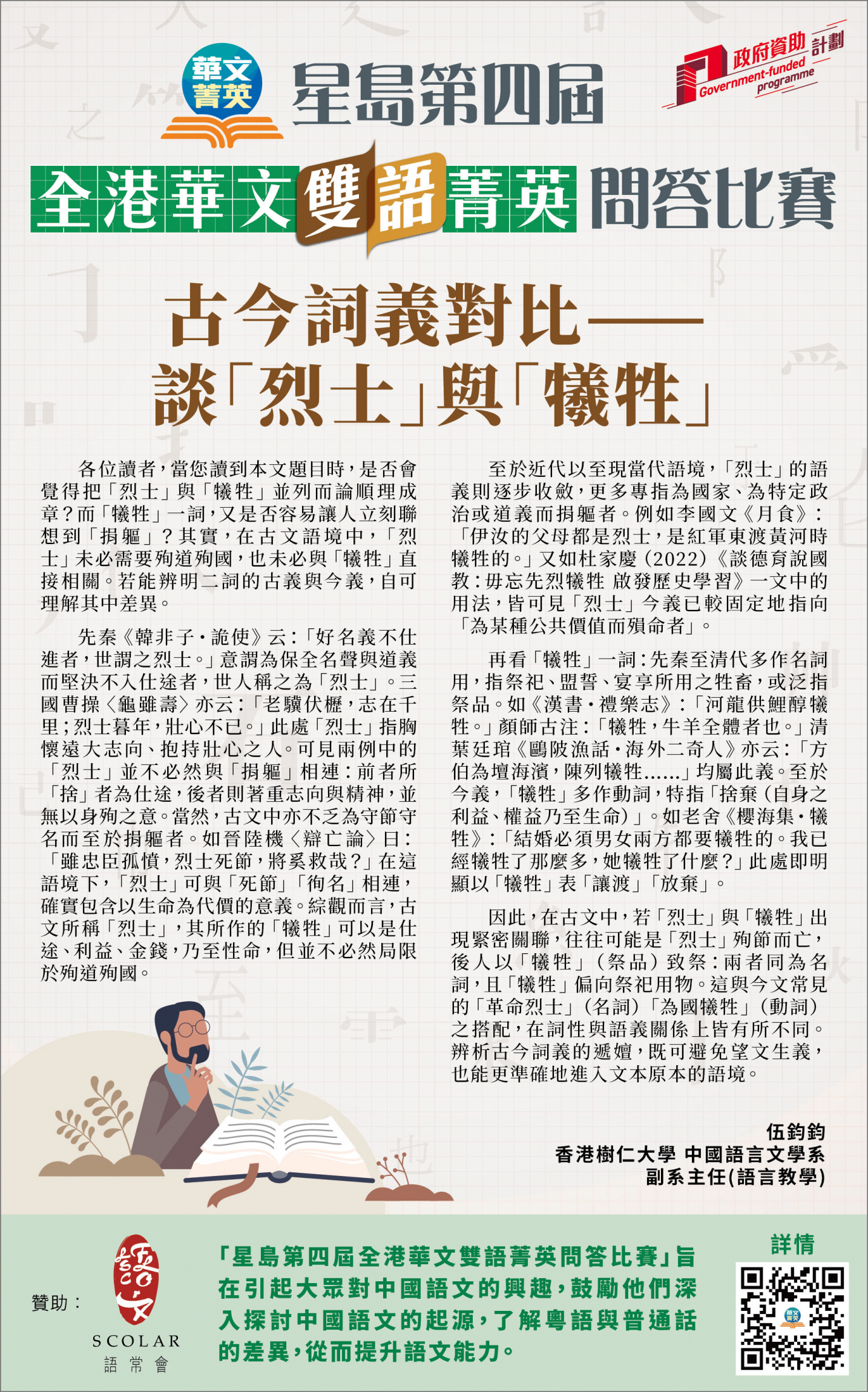 古今詞義對比——談「烈士」與「犧牲」— 伍鈞鈞博士 (香港樹仁大學 中國語言文學系 副系主任(語言教學))
