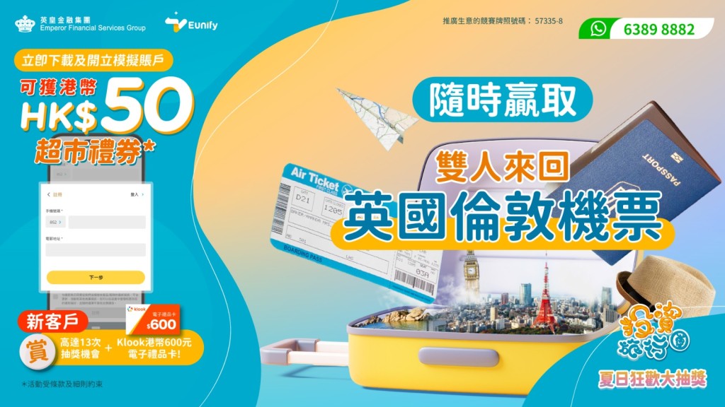 以App Eunify作交易前,不如先賺著數,現在下載App Eunify再完成開啟模擬投資戶口後,就可以得到50元超市禮券。新客戶於推廣期內 (由即日起至8月31日) 開戶並完成指定存款及交易要求,可獲高達13次抽獎機會隨時贏取雙人來回倫敦、馬爾代夫、東京機票及額外獲賞高達Klook 港幣600元電子禮品卡!想試試投資新意思,不妨試用App Eunify,感受邊投資邊賺禮品的樂趣。