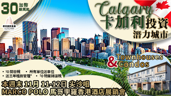 說到加拿大移居或地產投資,可能第一時間想到多倫多及溫哥華,其實卡加利Calgary也是近年非常熱門的城市,擁有就業機會多、消費指數低、稅率低及樓價低的優點,令卡加利在移居及投資方面備受注目。今個週末於尖沙咀展銷的卡加利上車盤, 只需加幣$30餘萬起,送包租保證、車位等多項優惠,同場亦會介紹多倫多市中心黃金地段新項目,值得留意!