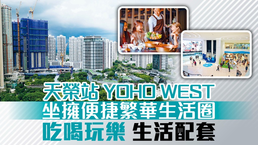 由新鴻基地產及港鐵合作發展的天榮站上蓋項目YOHO WEST分兩期發展,合共提供1967伙,現時第1期將約有1393伙,項目預期落成日期為2024年9月底。YOHO WEST主打2房或以下細戶,是近年上車客及小家庭最熱捧的戶型,屋苑優勢不僅有設備標準齊全的會所,衣食住行配套亦非常完善,尤其康樂文化公共設施如大型圖書館、公眾游泳池和體育館等,加上毗鄰逾60萬方呎商場,一家大小周末不愁消閒沒有好去處。此外,天水圍擁有大量綠化環境,不僅屋苑重視綠化面積比例,同時還鄰近偌大的天水圍公園、香港濕地公園,再遠一點便是南生圍,猶如香港北面的優美後花園。