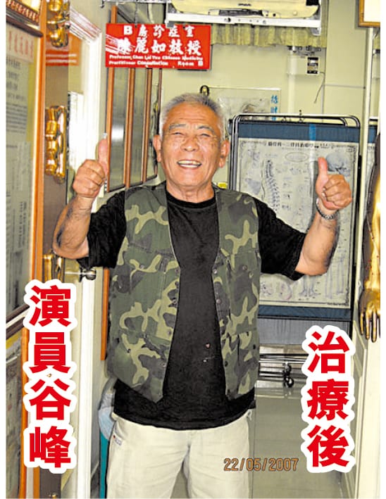 本人為演藝界的谷峰,患有腰部舊患勞損骨痛,右股部前後痛及坐久起步痛,行企痛、右大腿肌肉僵硬酸麻痹痙痛,運動練武時痛,屢醫無效,因好友朱先生數年前曾來採用【外敷中藥拈痛貼】奇好!特介紹本人前來一試!除痛功效快!進展奇佳!奇好!現練武運動強身!可以踢高腿,正常運動及出門拍電影,並介紹親友前來使用!特此鳴謝!