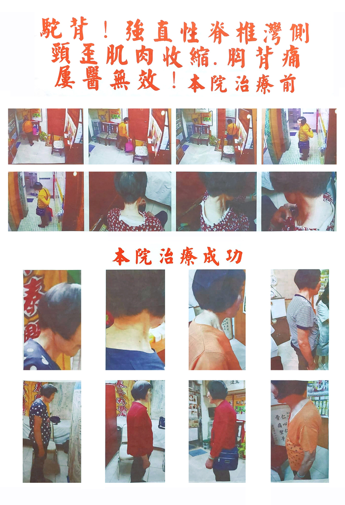 患者:【 駝背】強直性脊椎炎 脊骨灣側 胸背劇痛 ‘頸部‘肌肉收縮‘來診治療成功。康復痊癒。