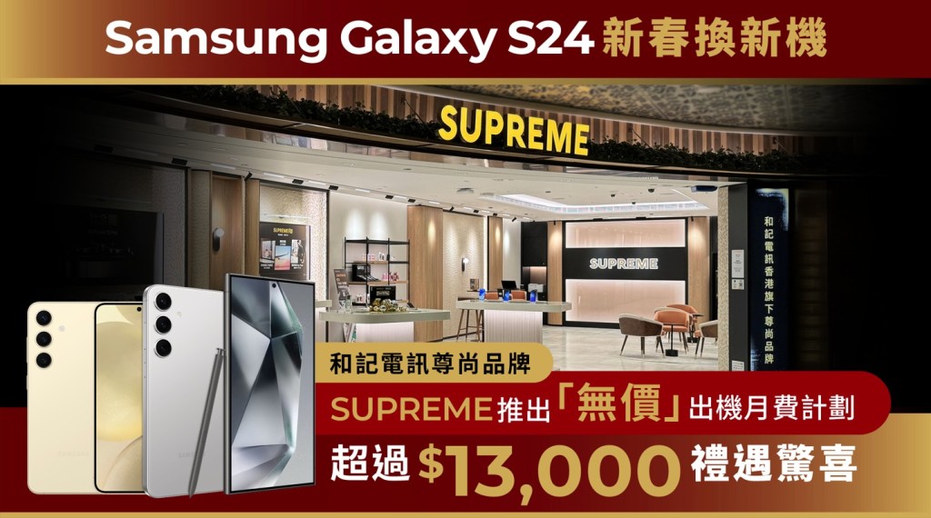 踏入2024年,Samsung率先落地應用AI人工智能,推出近期矚目的Galaxy S24系列。和記電訊尊尚品牌SUPREME的「零機價」月費計劃,為客戶呈獻獨家貼心禮遇,以及結合AI智能技術及優越數碼服務的「無價」體驗,一起「智」取新機迎新春!