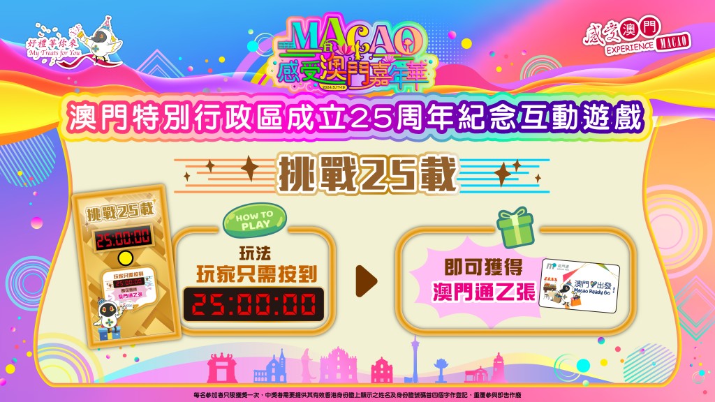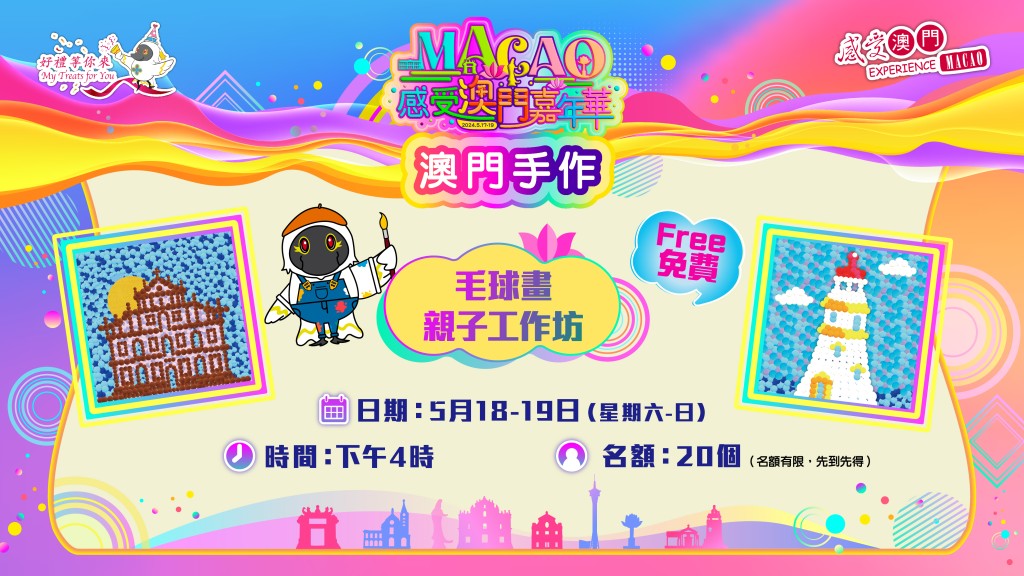 最後,「感受澳門嘉年華」還有專為小朋友而設的毛球畫親子工作坊,讓小朋友可以邊學邊玩;會場還有一系列介紹澳面歷史文化的展區,以及「挑戰25載」互動遊戲,玩家只需準確按到指定秒數,即可獲得澳門通一張。