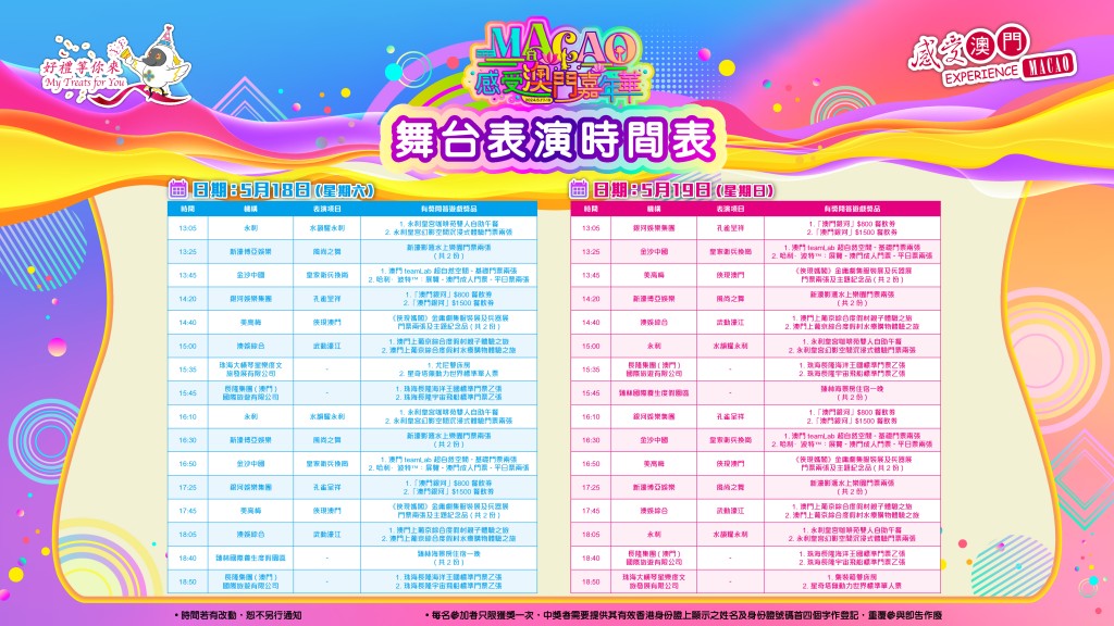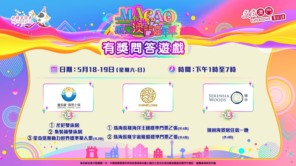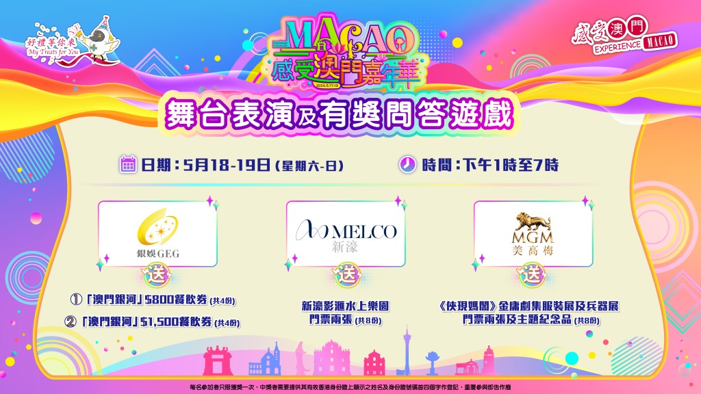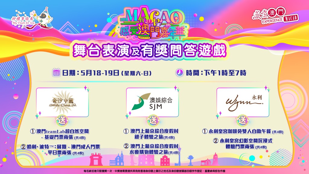 今次「感受澳門嘉年華」,六間「澳門綜合旅遊休閒酒店」帶來了一系列精彩表演,包括跳舞、唱歌、武術等,讓現場人士感受不一樣的澳門文化,除此之外,更設有獎問答遊戲,六間酒店及橫琴業界送出大量豐富禮品,包括酒店住宿、餐飲禮券、景點門票等,請你大玩特玩!