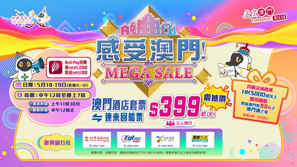 「感受澳門嘉年華」同場舉行「感受澳門MEGA SALE」,打算去澳門旅遊的朋友當然要特別留意。其中重點優惠有澳門旅遊局聯乘香港中國旅行社、東瀛遊、永安旅遊同專業旅運推出低至每位$399起的三人同行澳門酒店套票,如果用BoC Pay消費滿$1000更即減$100,單次消費滿$800或以上,即可換取價值$MOP50元的澳門通乙張,方便你暢遊澳門。