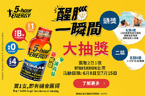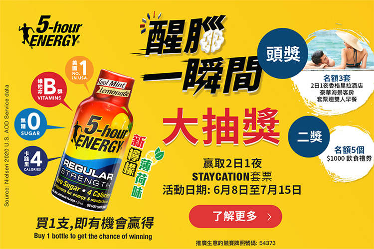 講到能量補充劑,又點少得係美國銷量 No.1 *嘅能量補充劑 5-hour ENERGY!5-hour ENERGY 最近出咗全新口味-新檸檬薄荷味,豐富嘅維他命B 群幫助大家短時間內補充能量,無糖配方仲啱晒想補充體力又怕肥嘅做 GYM 人士。而家 5-hour ENERGY 做緊大抽獎,由即日至 7 月 15 日,只要喺指定商戶購買一枝任何口味嘅 5-hour ENERGY,並上載有關收據至 5-hour ENERGY 網站,即可獲得一次抽獎機會,有機會贏取頭獎(2日1 夜香格里拉酒店豪華海景客房套票連雙人早餐)(名額 3 套)、二獎($1,000 飲食禮劵)(名額 5 個)!想了解更多詳情,記得瀏覽 https://www.5hourenergy.com.hk喇!