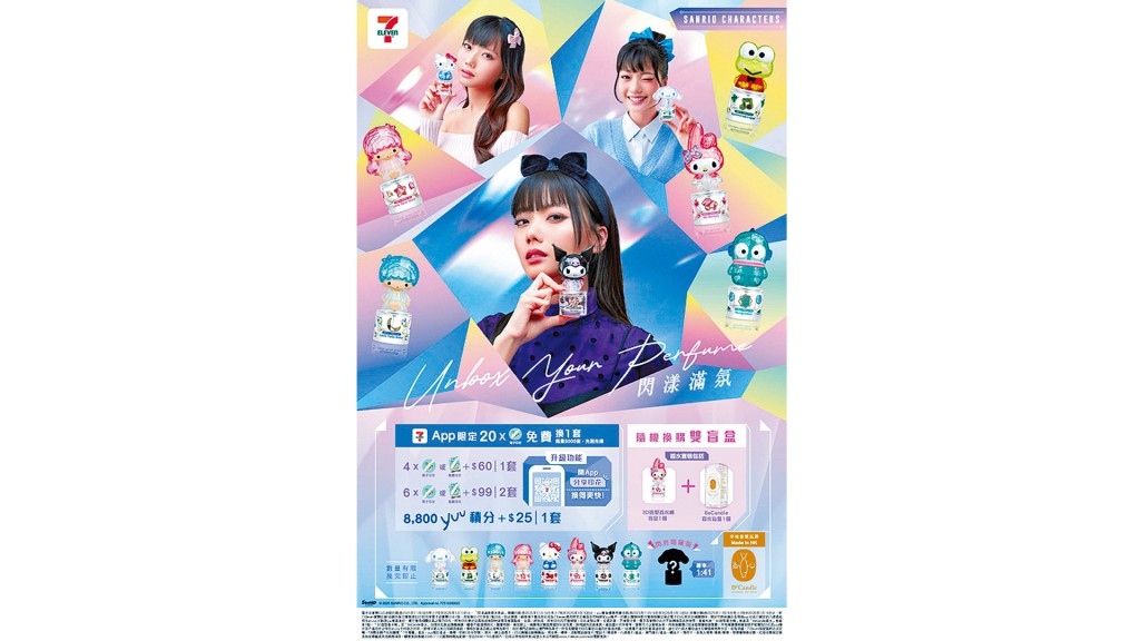 小妹又有好消息!7-Eleven破天荒同8位Sanrio人氣角色聯乘,打造全新「閃漾滿氛香水套裝」系列,並首度跨界聯乘本地香氛品牌BeCandle。