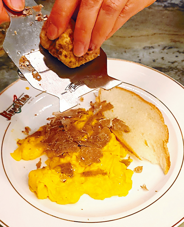 是夜阿Tom親於其酒舖為我們下廚,炮製以白松露入饌的菜式。他深知白松露最佳吃法是「簡單就是美」,以簡單食材去凸顯白松露的獨特芳香。當晚我們5人吃了兩顆共重85克的白松露(見圖),每人吃上17克,人均所費僅約1000元,菜式包括蘑菇湯、炒滑蛋、牛油汁全蛋麵及煎牛柳。當在這些簡單菜式上刨下片片白松露時(見圖),滿室飄香,菜餚的熱力令松露香味發揮淋漓盡致,直令我有飄然欲醉之感。那麼,如你問我如何形容白松露這氣味,我只能以感覺是混合泥土、大蒜、煤氣、蜜糖與禾稈草的氣味去形容,就是這種馥郁芬芳,令我趨之若鶩,如癡如醉!
