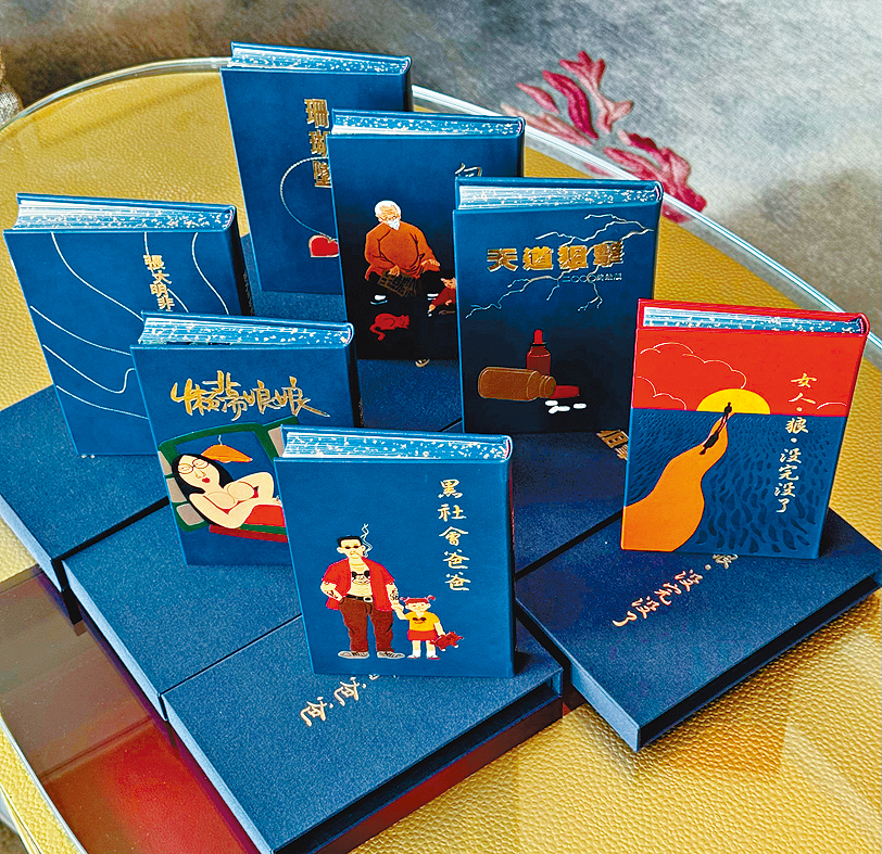 他們用的是進口的植鞣革牛皮,以手工貼皮拼圖,然後燙金箔,三面書口手工上色,再灑燙金箔而成。每本書的封面設計參照原裝形式,再以彩色皮革拼製,既不失原意,又煥然一新,並且獨一無二。如此精緻考究的七本書,當作送給自己七十歲的禮物,也是情趣。