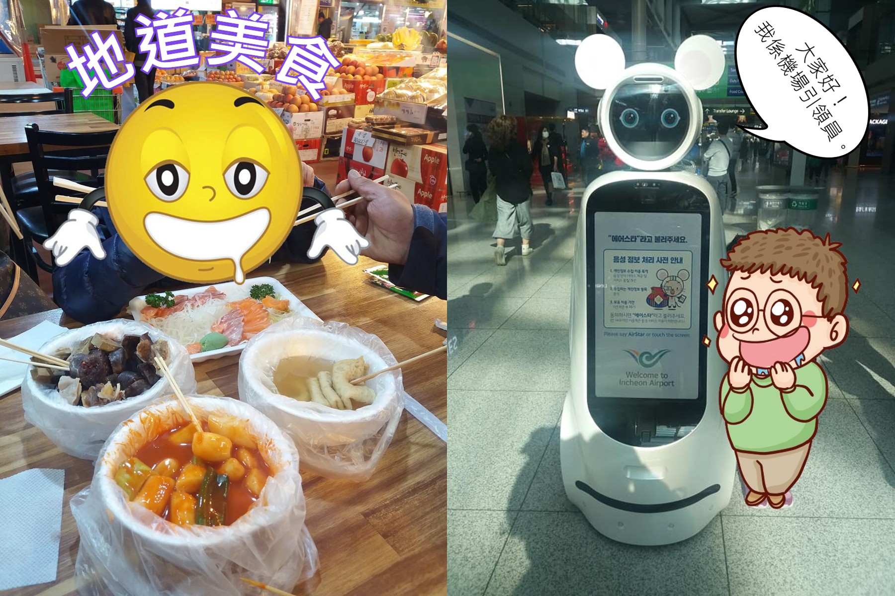 一入到街市,我哋見到幾檔海產店,即刻搜尋〝八爪魚〞嘅蹤影,好好彩搵到而且慶幸就算唔喺濟洲島都可以食到八爪魚剌身,之後就坐低食埋韓式年糕同米腸等等嘅地道小食。街市入面有好多形形式式嘅泡菜,大概有成30-40款比大家選擇,全部都係新鮮製作無防腐劑。除咗呢啲小型地道攤檔,亦有一間小型超市,好多團友都會買啲香港唔常見嘅韓國麵同粉絲,仲有pack箱服務添。到咗機場遇到個機械人,如果有唔識去嘅閘口、商店或地點,佢都可以作為引路者㗎,不過當然經常被小朋友圍住當玩具多啲啦。