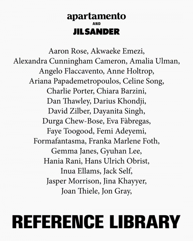 日本傳奇唱片店CISCO RECORDS於JIL SANDER東京銀座店內限定重新再現、釋出「JIL SANDER SOUND ZINE」企劃之後,JIL SANDER於米蘭設計週期間(4月20至24日)與西班牙室內設計雜誌《apartamento》於JIL SANDER Foro Showroom(Via Luca Beltrami 5)聯袂締造「REFERENCE LIBRARY」展覽,當中匯聚由來自世界各地具獨特視角作家、設計師、藝術家、建築師、電影製作人、思想家與創意之士等精心挑選60本書,每本書都反映個人參考、影響或記憶!