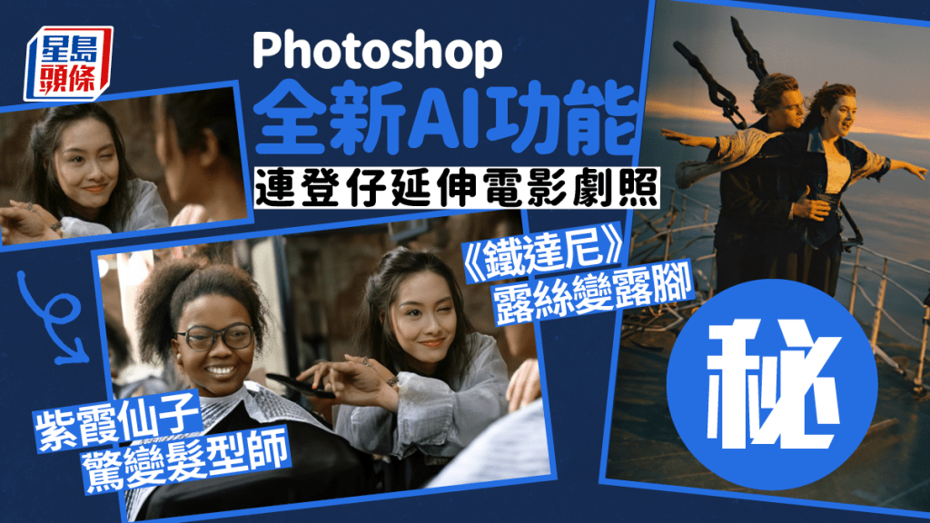 這回連登討論區網民將經典港產片及外國電影的經典劇照,包括《旺角卡門》、《西遊記大結之仙履奇緣》、《鐵達尼號》及《E.T》等,通過Photoshop(Beta)的AI延伸了劇照中所久缺的部分及位置,卻往往跟電影的原來場景大相徑庭,例如《西遊記大結局之仙履奇緣》電影中最經典的一幕,正是飾演紫霞仙子的朱茵單眼畫畫面,而AI將之生成為紫霞仙子幫一位黑人「四眼」女子剪頭髮,建構出爆笑的趣怪場面。