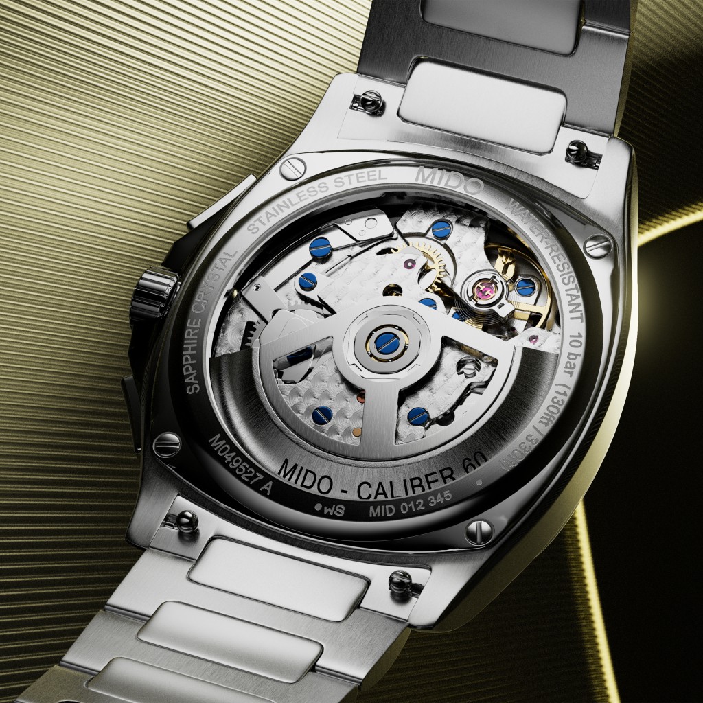 Mido的Multifort TV Chronograph復古造型入型入格,方中帶圓的錶殼,十足上世紀七十年代的電視機,在現今圓形腕錶當道的時候,這錶款明顯擁有極高的辨識度。錶盤不但擁有精緻的橫紋裝飾,灰至黑的漸變色調亦為腕錶增添視覺深度,襯上黃色刻度,令計時功能更見醒目。