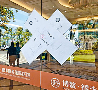 (星島日報報道)海南博鰲銀豐康養國際醫院爆出涉嫌非法接種九價HPV疫苗(子宮頸癌疫苗)的醜聞,引發各界關注。繼涉事醫院被吊銷執業許可證後,醫院大門於昨日更被貼上封條(見圖),疑被查封。醫院主要負責人亦被停職。