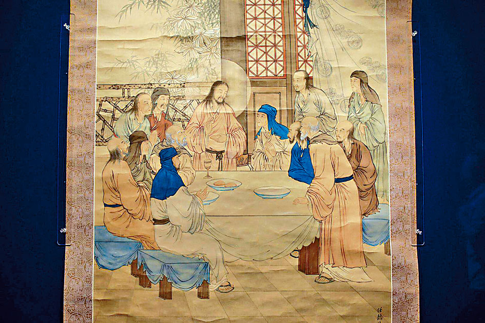 最受關注的展品是一百多年前中國畫家任懿芳、王肅達所創作的《最後的晚餐》。和熟知的意大利藝術家達文希名作《最後的晚餐》完全不同,這幅畫中耶穌及其十二門徒均是中國人面孔,身穿中國明代的服飾,不過都沒有蓄髮。畫中環境是中式裝飾,桌上的器具也是中國瓷器。