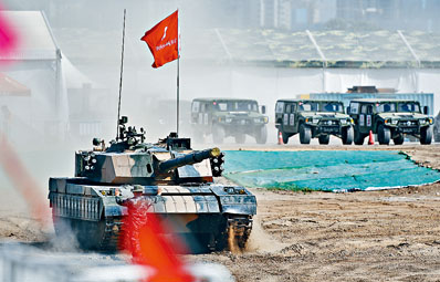 (星島日報報道)二○一九中國天津防務車輛裝備展,昨日向公眾開放。觀眾有機會近距離參觀中國防務車輛裝備並感受其優異性能,展品包括軍用車輛、警用車輛、安保車輛等裝備。圖為一輛新型國產坦克在展場作機動性能演示。